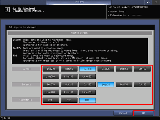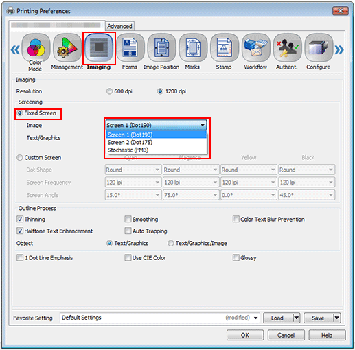 If an image is difficult to reproduce using the current screen (or auto selection), it is important to select the appropriate screen. When printing, there are three screen types to choose from: [Screen 1]/[Screen 2]/[Stochastic]. However, the screen assigned to each screen type can only be set by the administrator from the [Administrator Setting] menu.