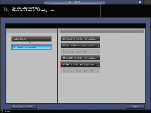 Press [Perfect Binder Adjustment] on the [Finisher Adjustment] menu.