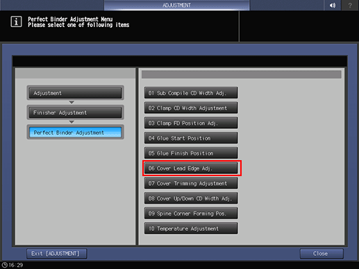 Press [Cover Lead Edge Adj.] on the [Perfect Binder Adjustment] menu.