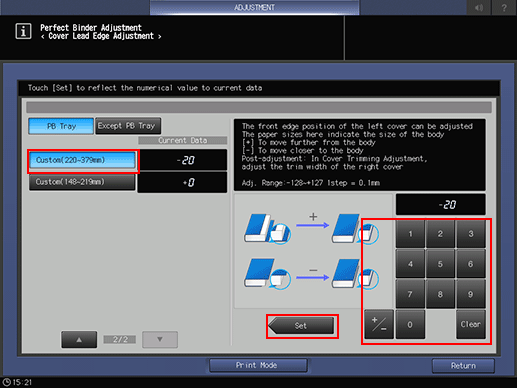 Use [+/-] to specify the value to be positive or negative. Set a positive value to move the left cover paper edge away from the body set. Set a negative value to move the left cover paper edge closer to the body set.