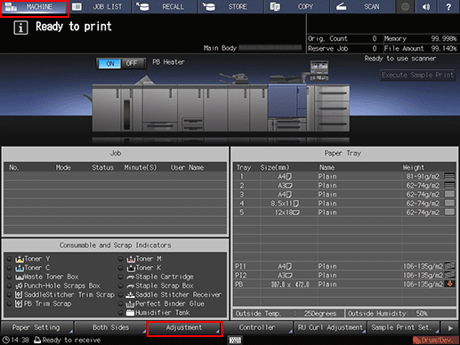 On the touch panel of the main body, press [Adjustment] on the [MACHINE] screen.