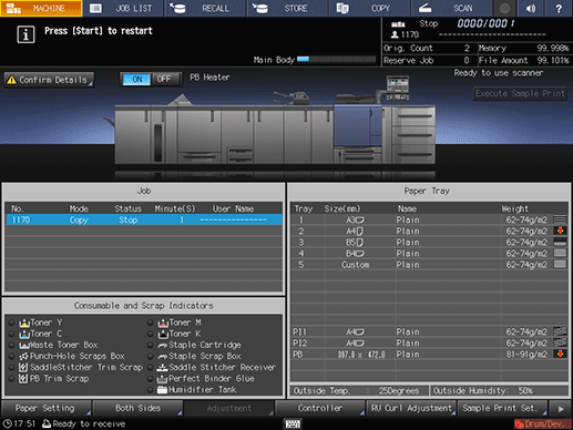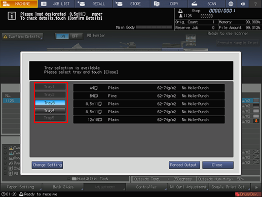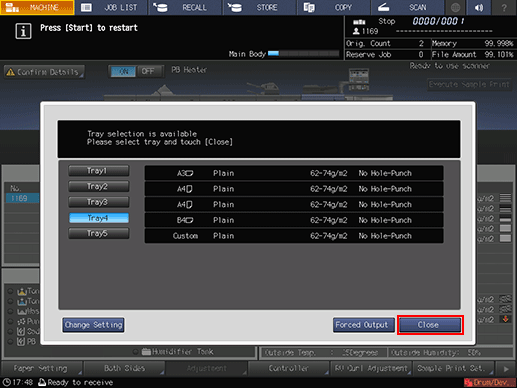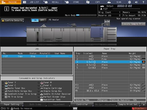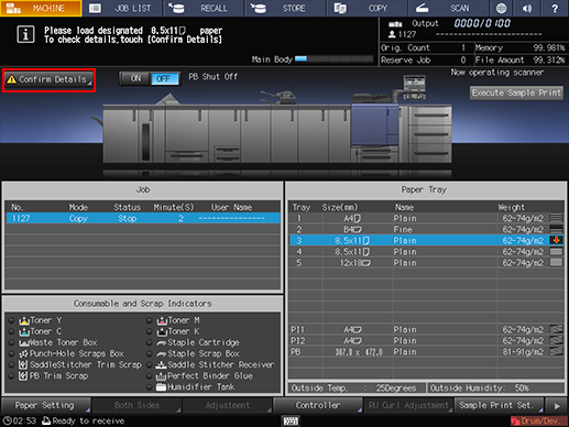 When the tray being used in a copy job becomes empty, printing stops and the message [Please load $########## paper in tray$ / To confirm details, touch [Confirm Details]] is displayed on the screen.
