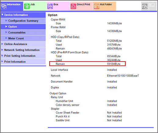 In [HDD (Pre-RIP/Form/Scan Data)] - [Remain], check the amount of available space.