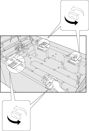 Turn the four side guide fixing knobs of the side guide plate (left) and the two side guide fixing knobs of the side guide plate (right) counterclockwise to loosen them.