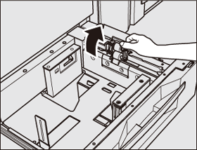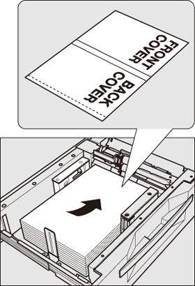 When making books bound on the right side, load cover paper with the front side up, and with the head facing the front side of the tray. Loaded covers will be trimmed on the left side when made into books.