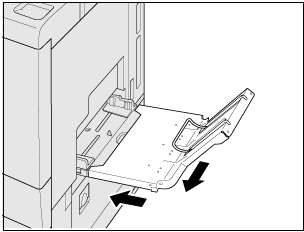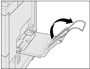 Push down the paper size sensor of Multi Bypass Tray MB-506 and put Banner Tray Unit MK-740 or Output tray reinforcing unit for banner MK-740m (feeding extension tray) on the bypass tray from top right to cover it.