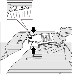 Do not load over the limit of the document feeder capacity or over the limit line indicated on the original guides; otherwise the original may be misfed or damaged, or machine trouble may be caused.