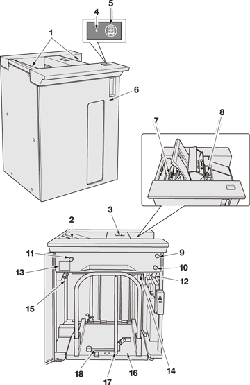 14 | Stacker tray | Holds sets output in both non offset and offset modes. |
