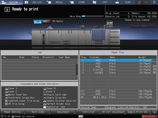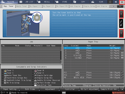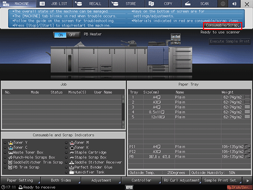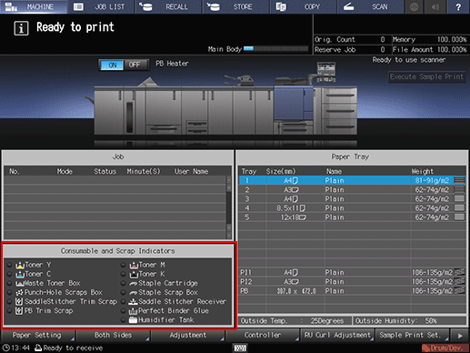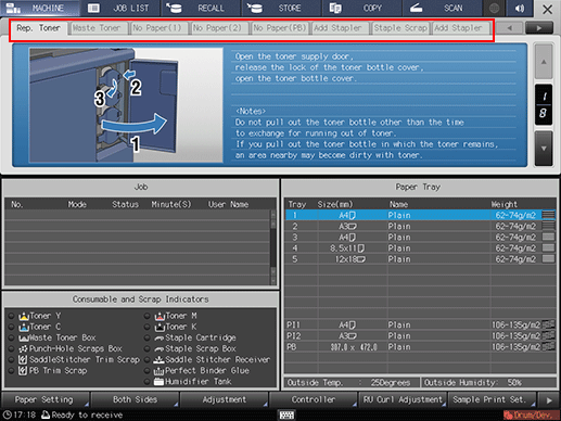 When the [MACHINE] screen is displayed, the instructions to replenish toner, replace waste toner boxes, add staples, dispose of staple scraps, punch scraps, and trimming scraps, supply glue pellets, replenish water to the humidifier tank, and load paper are displayed.