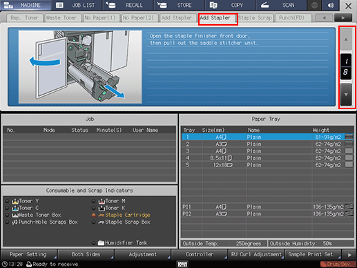 When the Finisher FS-532 is mounted with Saddle Stitcher SD-510 and the stapler in the saddle unit becomes empty, the following message will appear in the message area of the screen.
