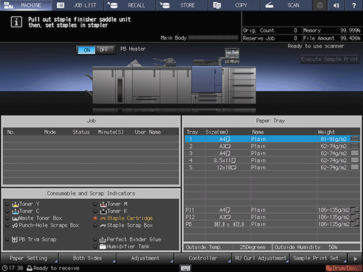 The Staple Cartridge indicator in the [Consumable and Scrap Indicators] area of the [MACHINE] screen lights up red, and the text color changes to yellow.