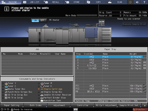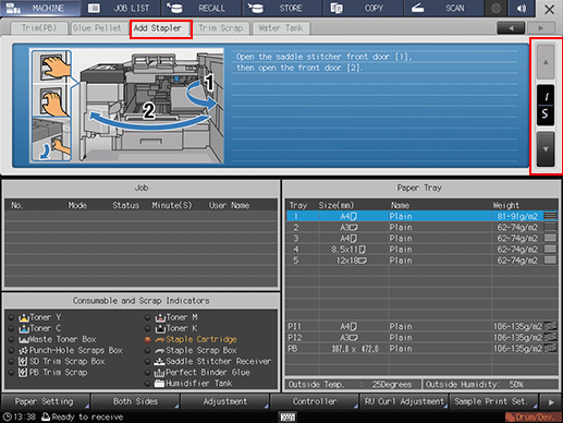 When the staple cartridge of Saddle Stitcher SD-513 becomes empty, the following message will appear in the message area of the screen.