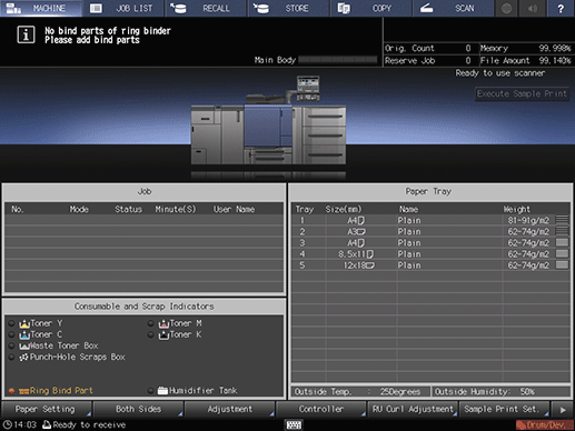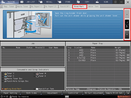 The Ring Bind Part indicator lights in red in the [Consumable and Scrap Indicators] area of the [MACHINE] screen.