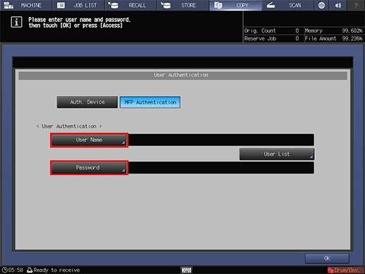 Even without an IC card, users can also be authenticated by pressing [MFP Authentication] and entering a [User Name] and User [Password]. However, when the administrator selects [Synchronize] for the Synchronize User/Account Track, users are not authenticated even if they enter a [User Name] and User [Password], unless an account is registered in the user registration in advance.