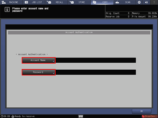 The [User Authentication] screen is displayed first. Hold the registered IC card over the Authentication Unit AU-201S and the [Account Authentication] screen is displayed.