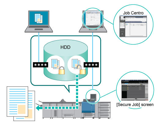 Using the secure job function allows you to print out a job with the password on the touch panel of the main body or use Job Centro after saving a print job in the Box on the HDD of this machine. At this time, secure jobs are automatically deleted after they are printed.