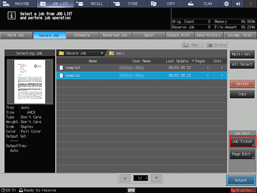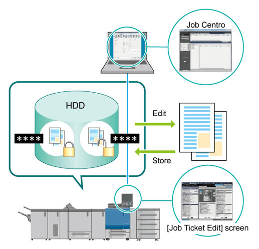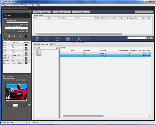 The secure job function changes print settings, edits data on a page basis, or prints data via the touch panel of the main body. You can also use Job Centro to edit a secure job, but you cannot edit a job that is being edited using the panel of the main body, a job that is edited for items other than the file name and the number of sets, and a job that can be edited only on the panel of the main body.