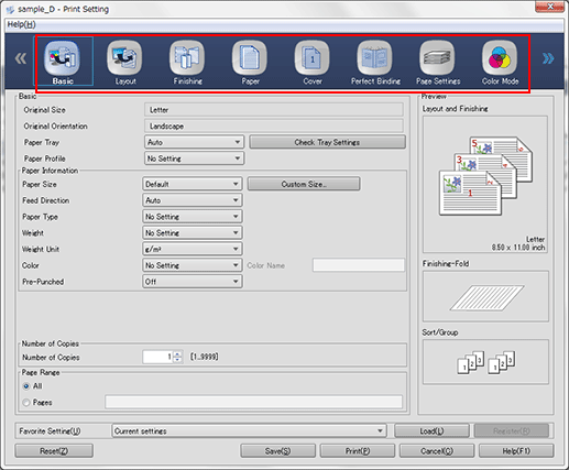 [Basic] | Original size, original orientation, paper tray, paper profile, paper information, number of copies, page range |