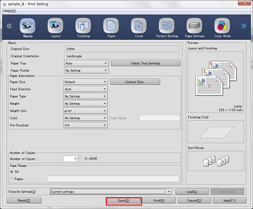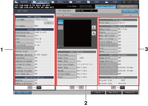 [Output Setting] | Set [Bind Direction][Sort/Group][Face][Order][Fold Print Side][Needless Tab Paper Exit], etc. | |