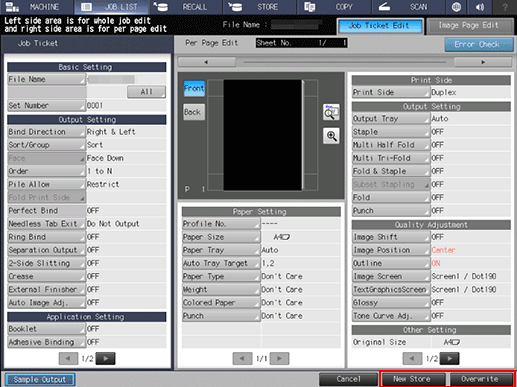 To check the output image with the current settings, press [Sample Output]. Only one set, the sheet being previewed, or the specified sheet is output so that you can check the actual result.