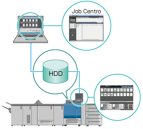 On the touch panel of the main body, you can edit a copy or scan job ([Job Type] is set to [Copy]) or print job ([Job Print] is set to [Print]). In Job Centro, you can only edit print jobs ([Job Type] is [Print]).