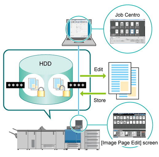 It is possible to copy/move/rotate/delete and make other editions of pages of secure jobs while viewing page thumbnails on the touch panel of the main body or a computer. The function is called "Page Edit."