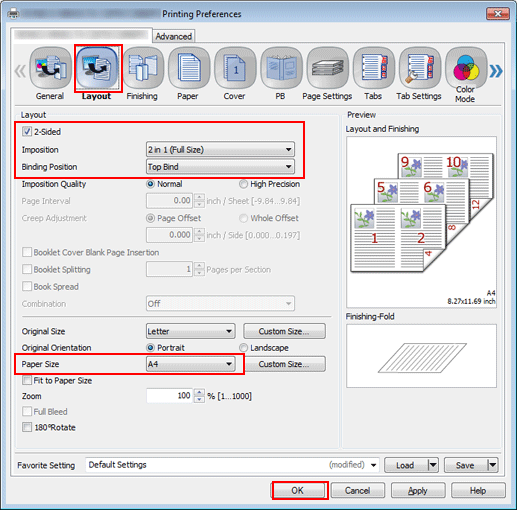 The example below creates a print setting that the original PDF file of 32 A4 pages is reduced and printed 2 in 1 on both sides of A4 paper.