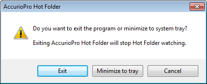 [Minimize to tray]: The [AccurioPro Hot Folder] screen closes. This is resident on the task tray to monitor the hot folder.