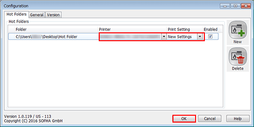 In [Hot Folders], select the target hot folder. In [Printer] and [Print Setting], select the printer required for the hot folder, then click [OK].