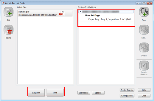 If you add this machine to AccurioPro Hot Folder and register a job setting, you can only add a file and select the printer and job setting to make print.