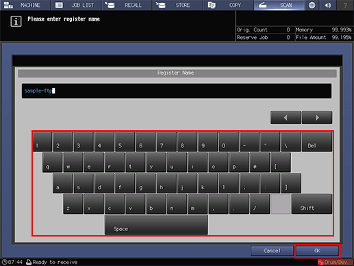 Register the destination FTP site to the machine on the touch panel of the main body.