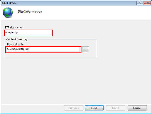 Enter an FTP site name and content directory, and then click [Next].