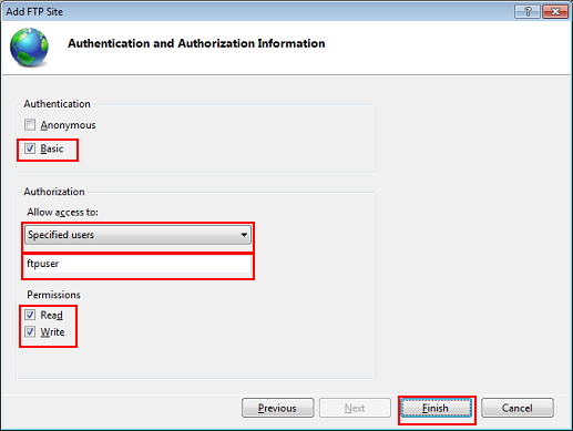 Set the authentication and authorization information, and then click [Finish].
