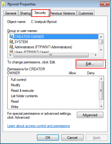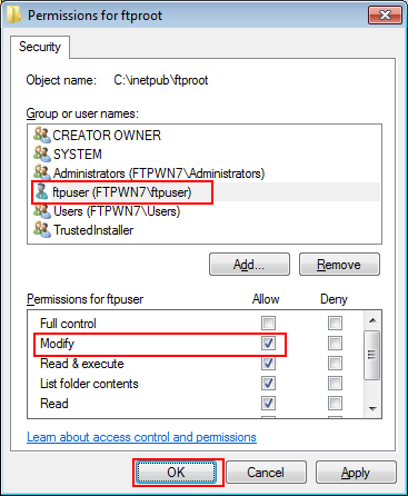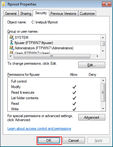 Example: Access permission is given to "FTPWN7\ftpuser".