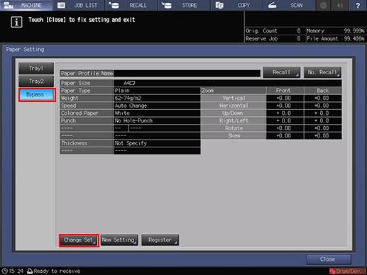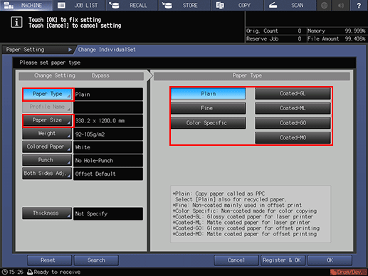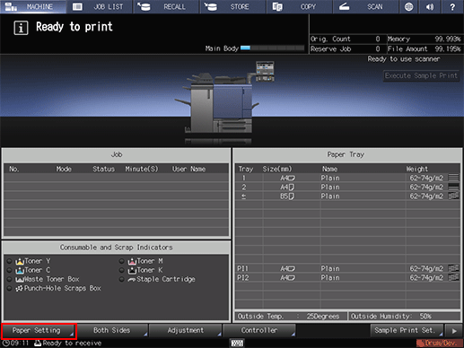 On the touch panel of the main body, press [Paper Setting] on the [MACHINE] screen.