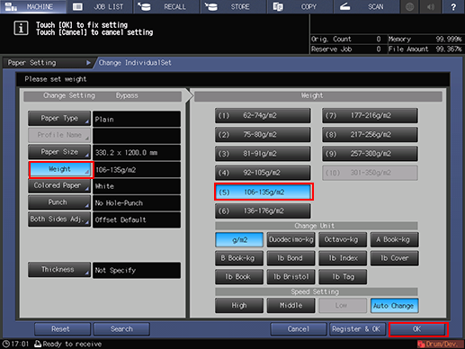 You can select [Coated-GL], [Coated-ML], [Coated-GO], and [Coated-MO] when you set the value of [Weight] to 81 g/m2 / 22 lb Bond or more. However, feedable coated paper is 128 g/m2 to 256 g/m2 / 34 lb Bond to 68 lb Bond.