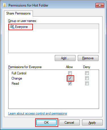 Select [Everyone], select the [Allow] check box in [Change], and click [OK].