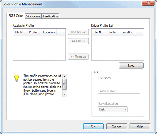 From the [Available Profile] list, select the profile you want to add to the printer driver, then click [Add Sel].