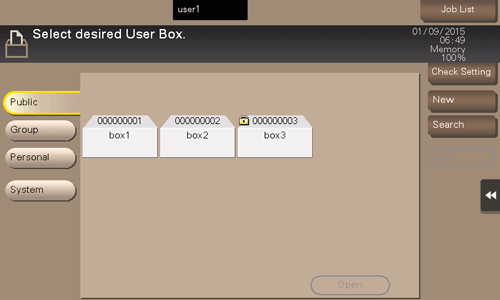 The System Box is used by the system to temporarily store files when the user uses the facsimile or print function together with the file storage function of the box.