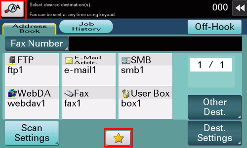 [Fax] | Tap this button to display the main screen in the fax mode. The fax mode only provides fax functions of the functions that are available in the scan/fax mode. This mode allows you to quickly recall the target function when using a fax. The fax mode has the following features.