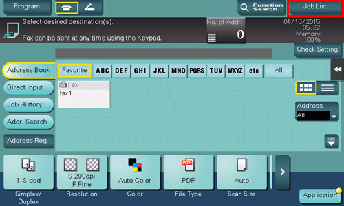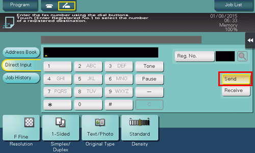 • Fax numbers can be specified from [Address Book], [Direct Input], [Job History] or [Program]. For details on how to specify a destination, refer to Here. For details on how to specify a fax/scan program, refer to Here.