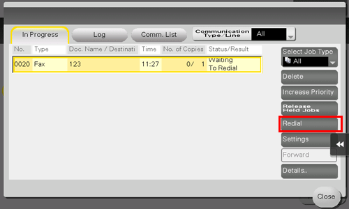 2. Select a job you wish to resend and tap [Redial].