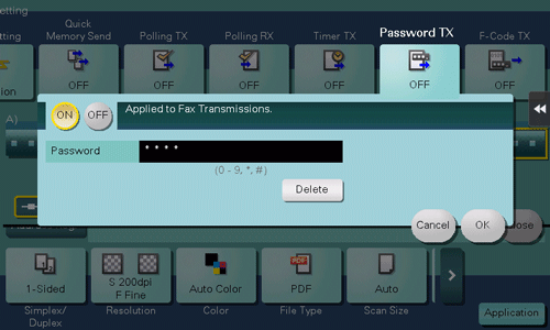 4. Tap [Application] - [Fax Setting] - [Password TX], then tap [ON].