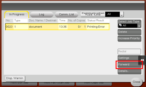 2. Select a job received using in-memory proxy reception, then tap [Forward].