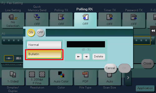 4. Tap [Bulletin], enter the number of the Bulletin User Box in the receiving machine using the Keypad, then tap [OK].
