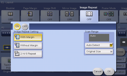• [2/4/8 Repeat]: Copy an original image repeatedly for the registered number of times on a single sheet of paper. Images that do not fit the divided area will be partially lost.