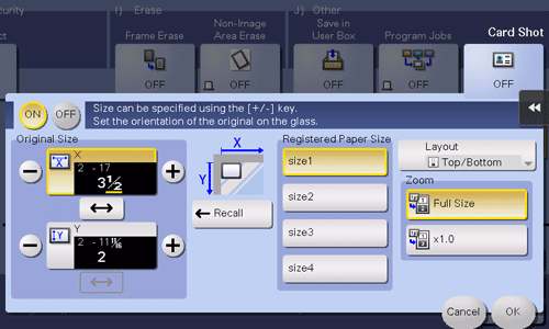 Specify the size of the card to copy by tapping [+]/[-] for the inch area, by tapping [+]/[-] or Keypad for the centimeter area. To display the Keypad, tap the input area for the numeral. From the [Registered Paper Size], you can recall a size previously stored and specify the size.