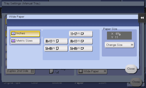 When loading wide paper in inch size into the Bypass Tray, select the paper size.