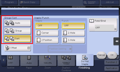 [Auto] | Automatically switches between Sort and Group according to the number of printed sheets for each set, and feeds out. If the number of printed sheets for each set is 1, the Group function is applied. If the number is 2 or larger, the Sort function is applied. |