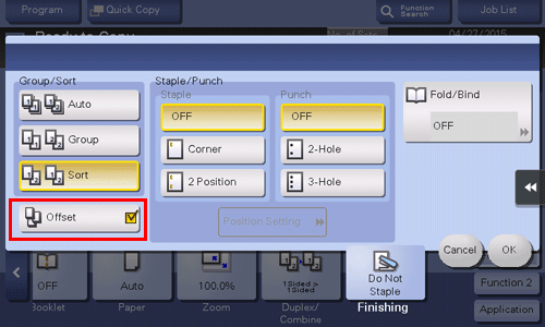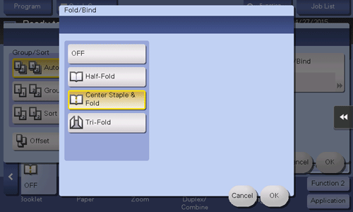 To use the Center Staple function, the optional Finisher FS-534 and Saddle Stitcher SD-511 are required.